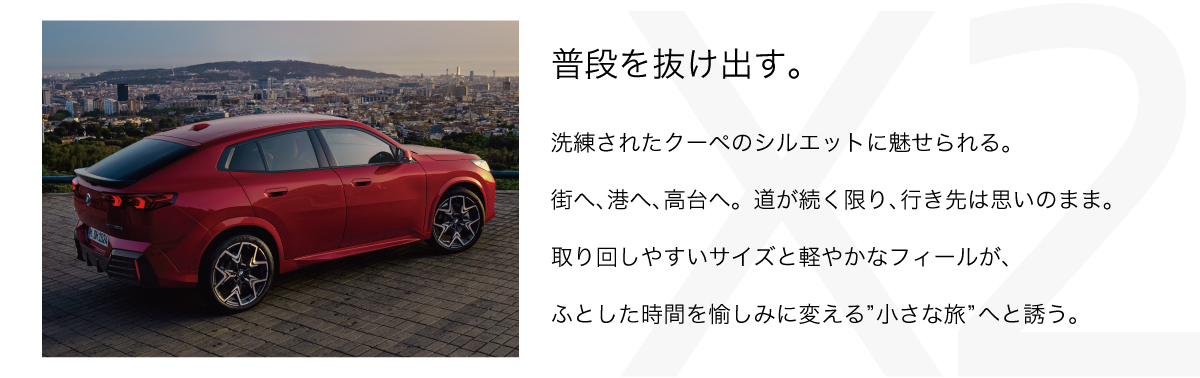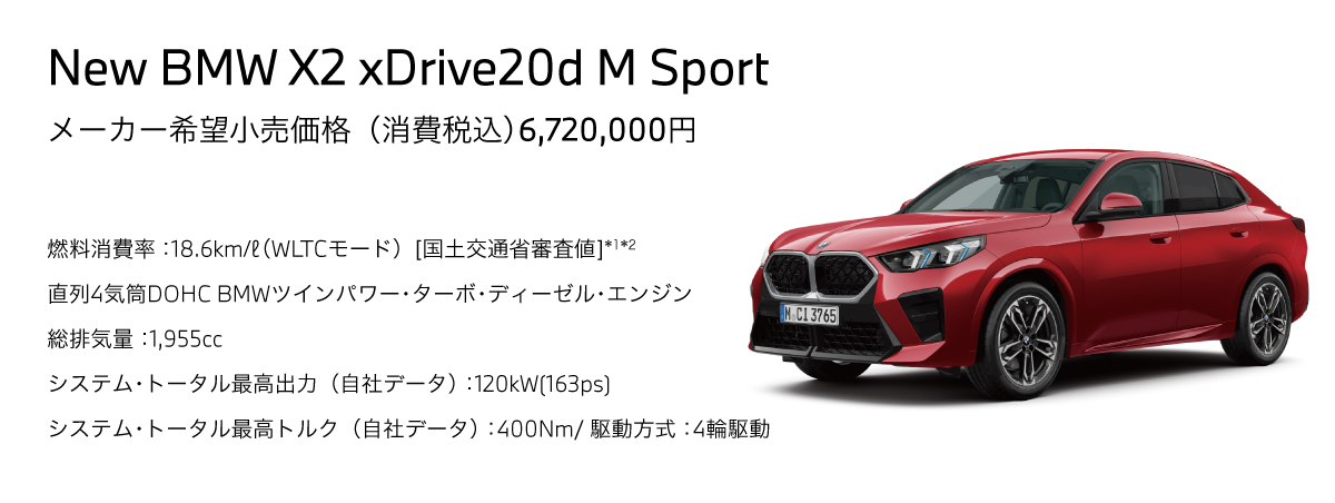 *1:燃料消費率は定められた試験条件での値です。使用環境(気象、渋滞等)や運転方法(急発進、エアコン使用等)に応じて燃料消費率は異なります。*2:WLTCモード:市街地、郊外、高速道路の各走行モードを平均的な使用時間配分で構成した国際的な走行モード。※表示の価格はメーカー希望小売価格(消費税込)で参考価格です。販売価格はBMW正規ディーラーが独自に定めておりますので、お問い合わせください。※価格および装備の設定等は、在庫車両の生産時期等により異なる場合があります。また、価格帯には受注生産モデルも含みます。詳しくはBMW正規ディーラーまでお問い合わせください。※価格(リース料を除く)には、税金(消費税を除く)、保険料、登録に伴う諸費用、付属品価格等は含まれません。※リース契約の場合を除き、リサイクル料金が別途必要となります。※価格は予告なく変更する場合がありますので、あらかじめご了承ください。※記載の諸元やデータは国土交通省届出値を基にしていますので、メーカー公表値と異なる場合があります。また、一部ヨーロッパ仕様車値を含みます。※使用している写真は印刷物のため、実際の色合いと異なる場合があります。※プロダクトに関する詳細はwww.bmw.co.jp、またはBMW正規ディーラーにてご確認ください。※以上の内容は、予告なく変更、終了する場合がございます。※世界規模の半導体部品供給難等により、一部の標準装備やオプションの設定削除、およびパッケージ・オプションに含まれる装備の変更が発生する場合がございます。最新の装備/設定や価格の詳細につきましては、BMW正規ディーラーまでお問い合わせください。※記載の内容は2025年9月8日現在のものです。